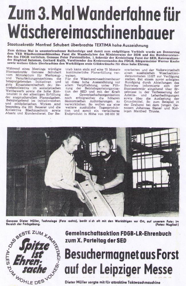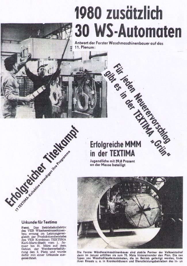 In den 80er Jahren entwickelte sich auch kontinuierlich die Produktion des Betriebes. Wurden 1981 Waren im Wert von 47.154 TM produziert, so wurde 1987 mit 63.277 TM die 60 Mio Mark deutlich überschritten. Der Durchschnittslohn der Werktätigen entwickelte sich von 859,— Mark 1980 auf 1.030,— Mark 1987. Auch für die Wäschereimaschinenbauer galt: „Für gute Arbeit guter Lohn".