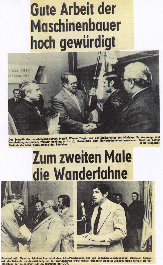 Am Ende der 70er Jahre konnte unser Betrieb auf eine 30jährige Entwicklung als volkseigener Betrieb zurückschauen. Mit den Leitungskadern an der Spitze ist es dem gesamten Betriebskollektiv gelungen, eine erfolgreiche Bilanz nachzuweisen. Unser Betrieb wurde zu einem strukturbestimmenden Betrieb im Kreis Forst. Er ist führender Hersteller von Großwaschmaschinen im RGW-Bereich. Ausdruck für die erreichten Ergebnisse ist das sich ständig und kontinuierliche entwickelte Produktionsvolumen. Im Bereich der industriellen Warenproduktion und des Exports zeugen kontinuierliche und erhebliche Steigerungsraten von der Leistungsfähigkeit der Wäschereimaschinenbauer.Entwicklung der IWP und des Exports 1950 60 787,8 % 176,3 % Steigeru ng 1960 65 126,3 % 176,2 % Steigerung 1965 70 243,6 " 0 291,7 % Steigeru ng 1970 75 139,8 % 142,9 % Steigeru ng 1975 80 154,0 % 143,0% Steigeru ng 1981. 87 134,0 % 151,3% Steigeru ng